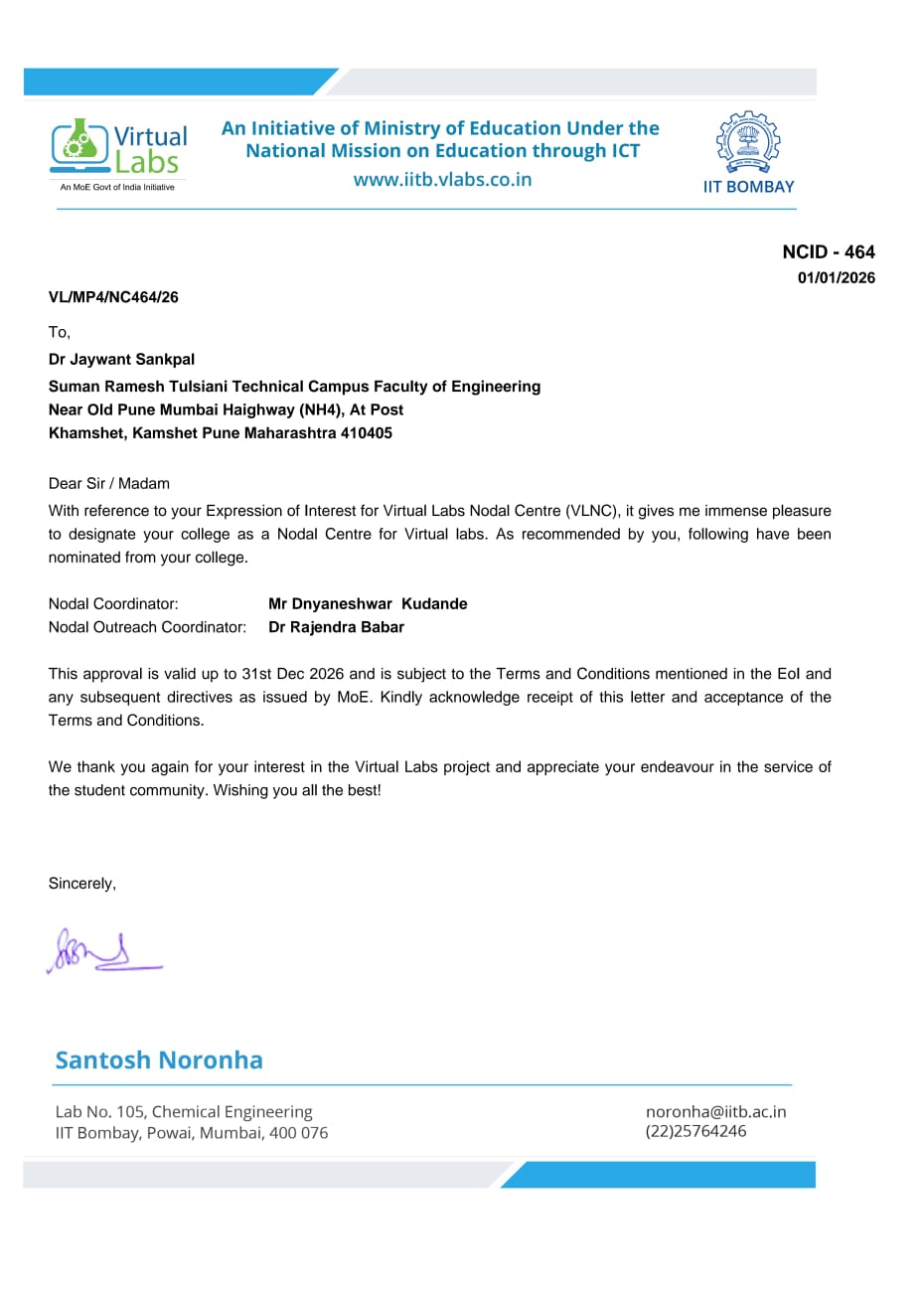 Our institute has officially received approval from IIT Bombay as Nodal Centre for Virtual Lab. This is a significant milestone that reflects our commitment to providing with innovative and high-quality learning experiences.